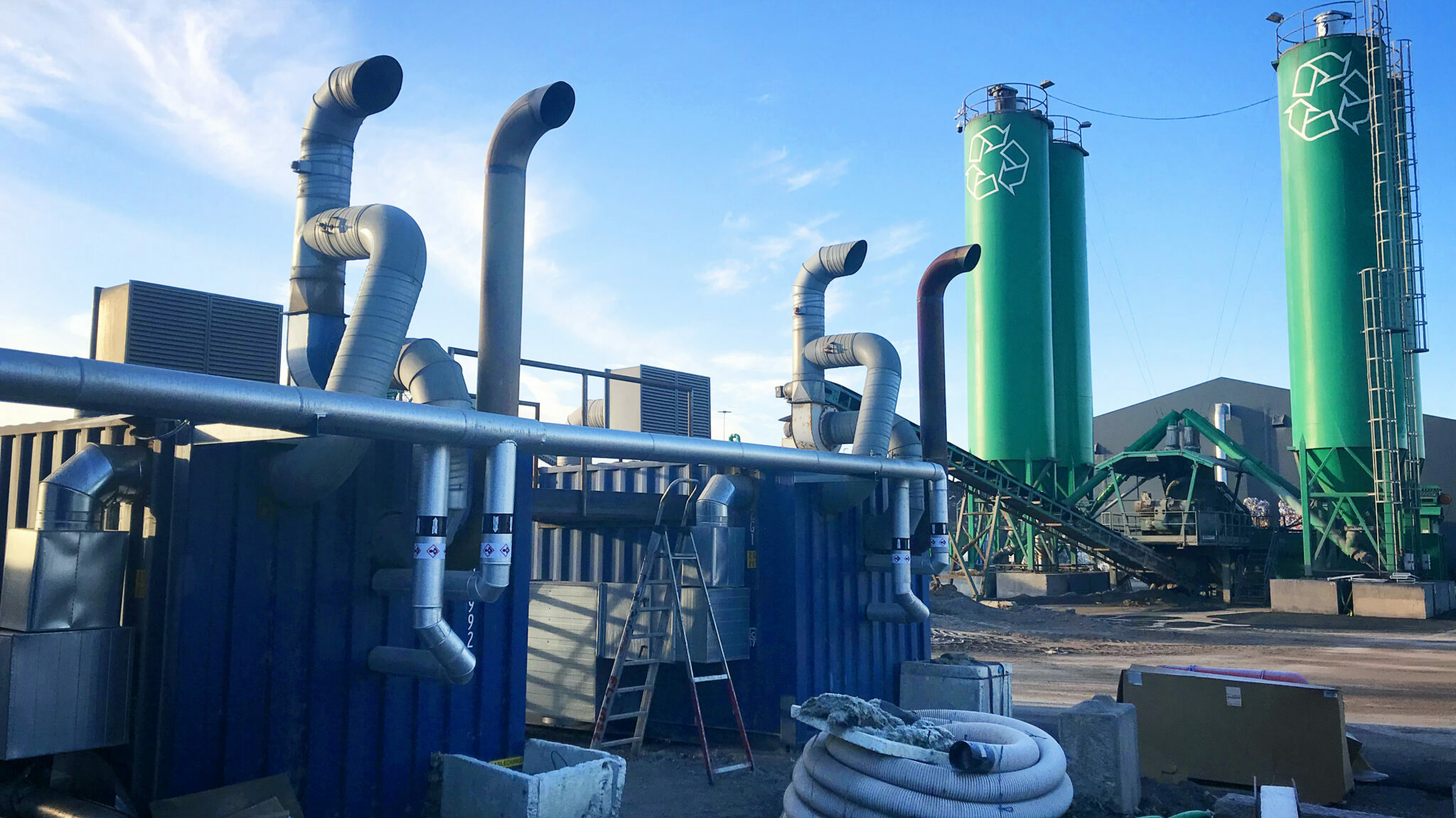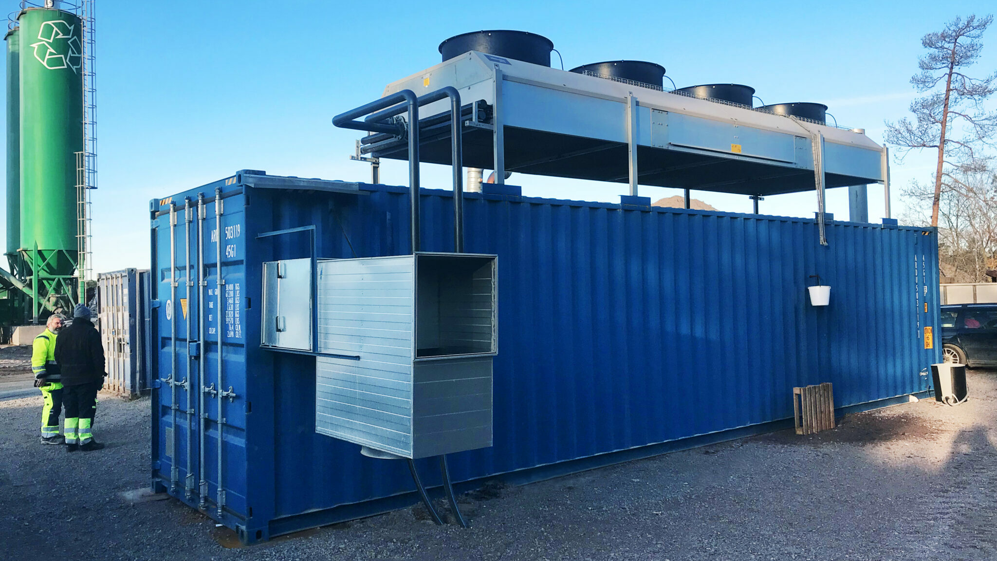 Againitys ORC-system för 120 kW elproduktion installerad i container tillsammans med deponigaseldad hetvattenpanna och luftkylning (bakifrån).